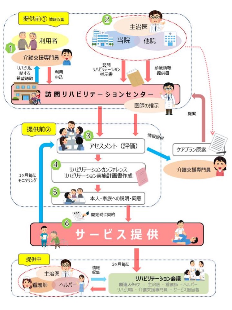 訪問リハビリテーションは、主治医(かかりつけ医)の診療情報提供書に基づいた医師の指示書が必要です(訪問診療または外来受診)。詳細については、担当ケアマネージャーもしくは当事業所にご相談ください。